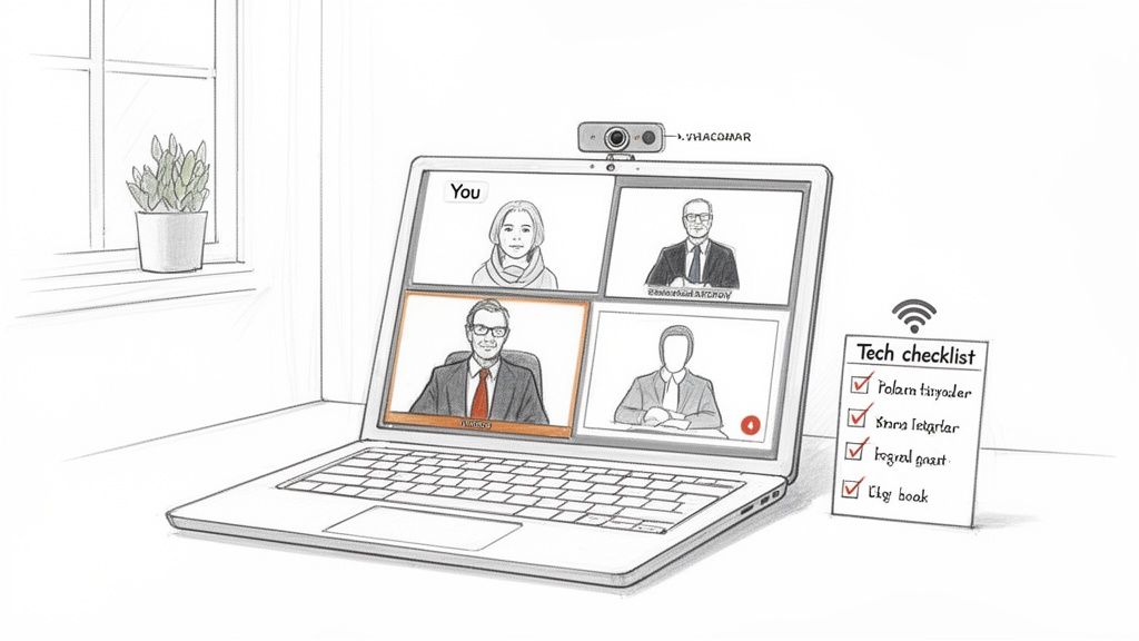 - Check Your Background: Keep what's behind you neutral and clean. A plain wall or a tidy bookshelf works perfectly. Steer clear of personal photos, messy areas, or virtual backgrounds, which can be distracting.